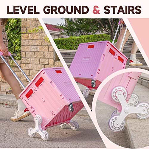 Honshine Foldable Cart with Stair Climbing Wheels, Collapsible Rolling Crate with Telescoping Handle, Handcart for Grocery Book File Tool Art Supplies(Pink)