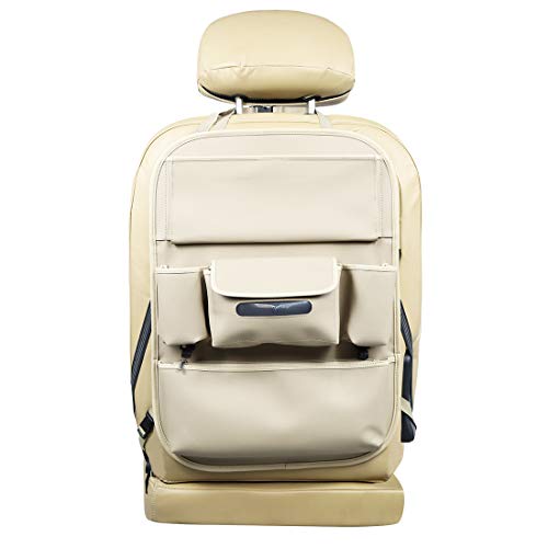 Viaviat Car Seat Organizers Waterproof Backseat Protector with Storage Pocket Large Leather Kick Mats for Kids Pets Automobile SUV Truck (Beige, Large Pocket)