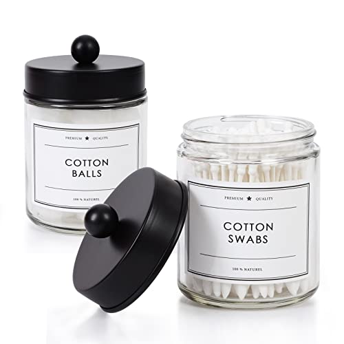 Specification: KUSVADO 2-Pack Bathroom Apothecary Storage Jars, Vanity Countertop Canister, Glass Jars Q-tip Holder, Cotton Swab Container, Bathroom Storage Container with 8 Pcs Waterproof Labels (9 Oz, Clear)
