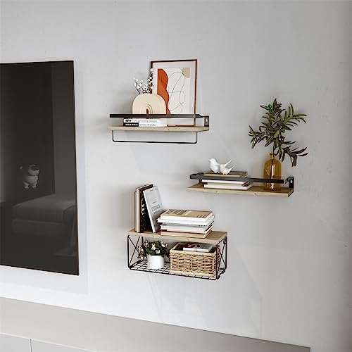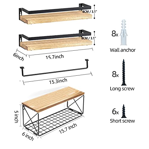 Sturdy & Easy to Assemble: It only takes a few minutes to follow the instructions and complete the mounting, then you can curate your own storage for wall. Each shelf: 15.7 X 6 X 0.6in. Package includes 3 boards, 2 metal brackets, 1 wire basket, 8 plastic anchors, 8 long screws, 6 short screws, 1 towel rack and 1 installation manual, giving you everything you need to complete the process. Note: When installing on drywall, the thickness of the drywall must be greater than the length of the long screws (4cm) for secure installation.