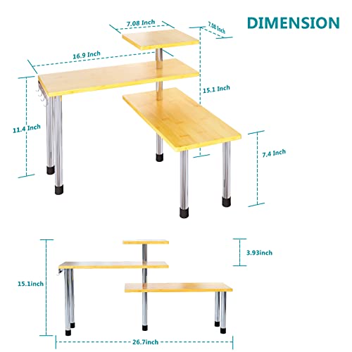 【High Quality & Sturdy】 The over sink shelf is made of bamboo wood, which is easy to clean and stable on the countertop. Tube legs with 5 plastic non-slip feet, allow the shelf to stand firmly on the table and prevent items from falling.