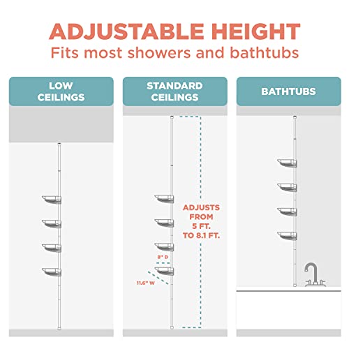 CADDY EXTENDS TO FIT A RANGE OF SHOWER SIZES: Innovative tension mechanism easily adjusts caddy height from 5 feet to 8 feet, 1 inch to fit most standard showers; pole has a .875 in. diameter