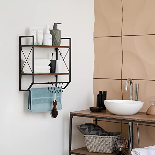 Bathroom Towel Rack 2 Tier Wall Shelf with Towel Bar, Rustic Towel Rack with Shelf for Wall Storage Shelves with Hooks Over Toilet Shelf Wall Mounted Towel Holder Shelf Floating Shelves for Home Brown