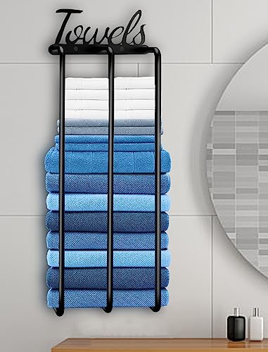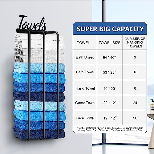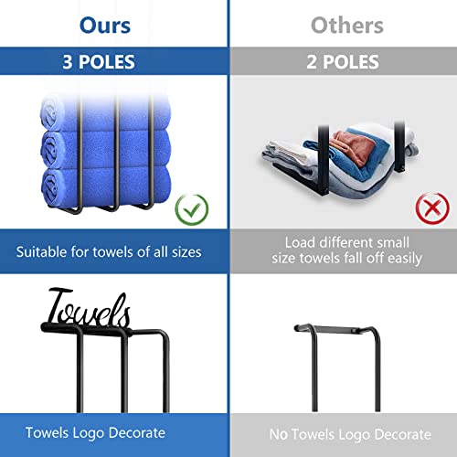 [Elegant Bathroom Decoration]- Fancy design of “Towels” logo on this bath towel holder for bathroom wall lights up your bathroom. Neatly rolled towels sit on a wall towel rack for a nice display while also maximizing bathroom storage space. 4 Classic colors that will blend in with any bathroom decor, prevent clutter and free up the bathroom.