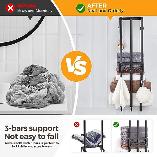 【Sturdy & Durable Bathroom Towel Rack】 The towel racks for bathroom is made of thickened metal bars and has black anti-rust coating, you can feel the sturdiness and durability of the bath towel holder after long time using the towel organizer for bathroom.
