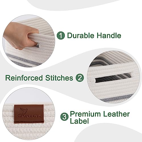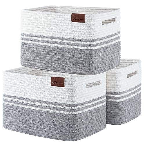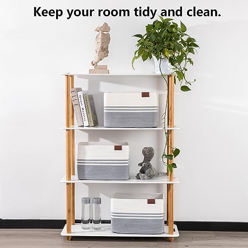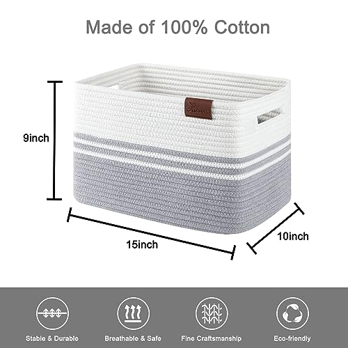 SIXDOVE 3 Pack Shelf Baskets, Woven Cotton Rope Storage Bin, Soft Rectangular Closet Basket Set, Long-Lasting & Stylish, Decorative Organization for Clothes, Toys, Books, Grey, 15”L x 10”W x 9”H