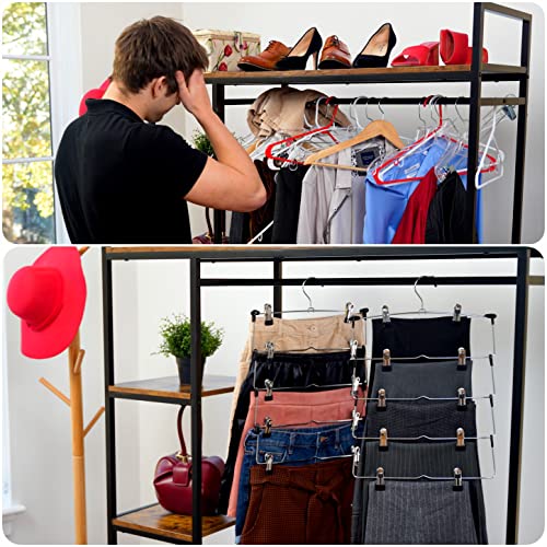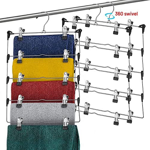 🔥 SPACE SAVING PANTS HANGERS- 5 tier trousers hangers, each hanger can hold multiple pants on the hanger, trousers or other clothing. Maximize to save your closet space and keep it clean and orderly. Strong bearing strength and won’t be easy to be out of shape. The hanger has a 360° swivel hook that allows you to turn your clothes without moving the hanger, making hanging clothes a breeze.