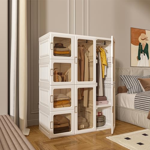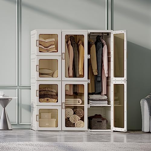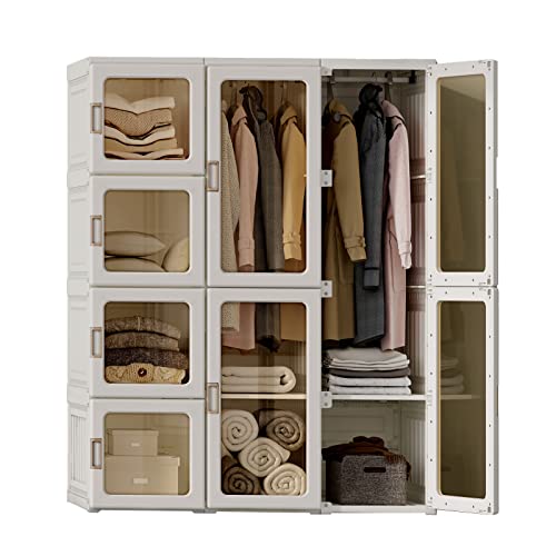 ANTBOX Portable Wardrobe Closet Storage Organizer for Clothes,Transparent Door Panels,Plastic Wardrobe with Magnetic Door and Easy Assembly 6 Cubes & 2 Hanging Rod