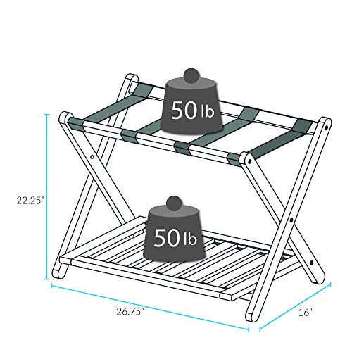 Welcome your guests with a convenient spot to pack and unpack with this Hotel-Style Folding Luggage Rack. Wide 27″ top accommodates most luggage. Sturdy construction supports up to 150 pounds on the top shelf and 50 pounds on the lower for worry-free use. And the convenient lower shelf doubles as a makeshift shoe rack or simply an extra space to store items off the floor. Folds easily and compactly for storage, ideal for busy homes that house frequent visitors.
