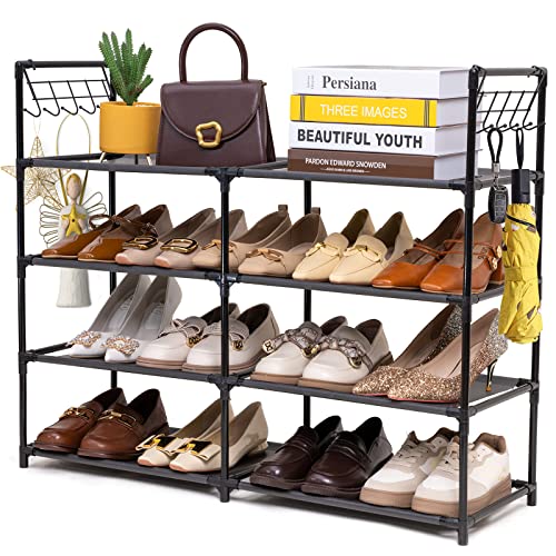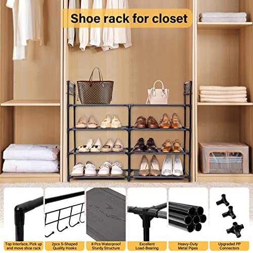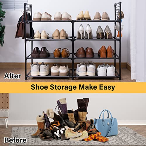 Elechotfly 16-20 Pairs Shoe Storage Organizer, 4 Tiers Shoe Rack/Stand, Easy Assembly Stackable Sturdy Shoe Tower with 2 Hooks, Metal Shelf for Entryway, Closet, Garage, Bedroom, Cloakroom