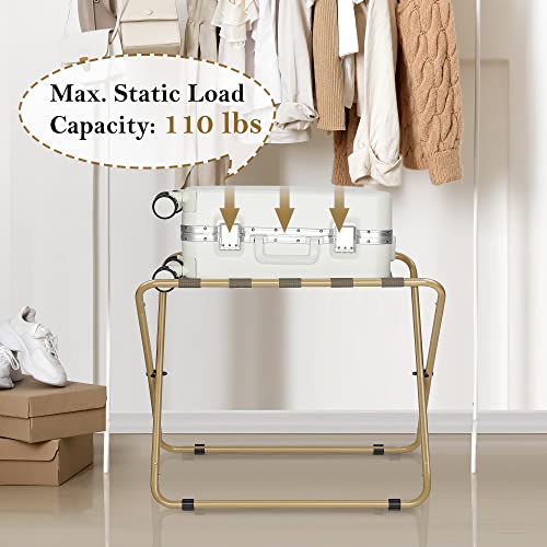 Specification: ELYKEN 2 Pack Folding Luggage Rack for Guest Room, Heavy Duty 110LBS Load Bearing Metal Suitcase Stand, 28.37”L x 17.7”W Wider Surface with Nylon Strap, Gold