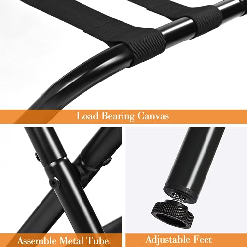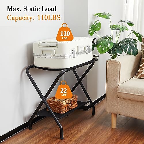 Specification: ELYKEN 2 Pack Luggage Rack for Guest Room, Folding Suitcase Stand with Storage Shelf, Heavy Duty Steel Frame, Max Load 132 LBS, Easily Assemble Luggage Holder for Bedroom Hotel, Black