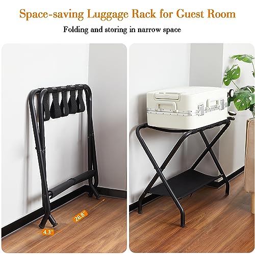 ELYKEN 2 Pack Luggage Rack for Guest Room, Folding Suitcase Stand with Storage Shelf, Heavy Duty Steel Frame, Max Load 132 LBS, Easily Assemble Luggage Holder for Bedroom Hotel, Black