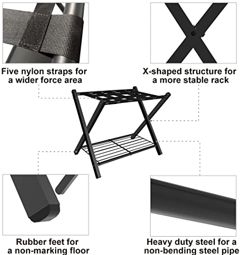 Specification: Fandature Folding Luggage Rack for Guest Room, Metal Foldable Suitcase Stand Holder with Metal Shelf for Bedroom, Black, 1pack