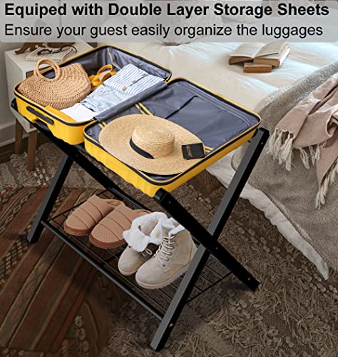 Fandature Folding Luggage Rack for Guest Room, Metal Foldable Suitcase Stand Holder with Metal Shelf for Bedroom, Black, 1pack