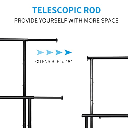 EXTENSIBLE:Extensible top horizontal rod from 30.5” to 48”. Top hanging rail designed with integrated circular tubing and stoppers on each side to prevent the clothes from falling