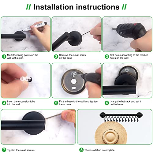BIG CAPABILITY HAT RACKS: The hat rack for baseball caps includes two wall-mounted black poles and 24 detachable metal rings with clips. Hat holders can hold up to 24 hats, which have storage, protection, and display functions.