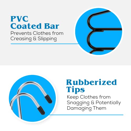 These metal pant hangers are made of steel with a black non-slip coating, making it a good alternative to velvet pant hangers. The sturdiness makes this pants rack a great jeans hanger while keeping your pants, slacks, and trousers neat.