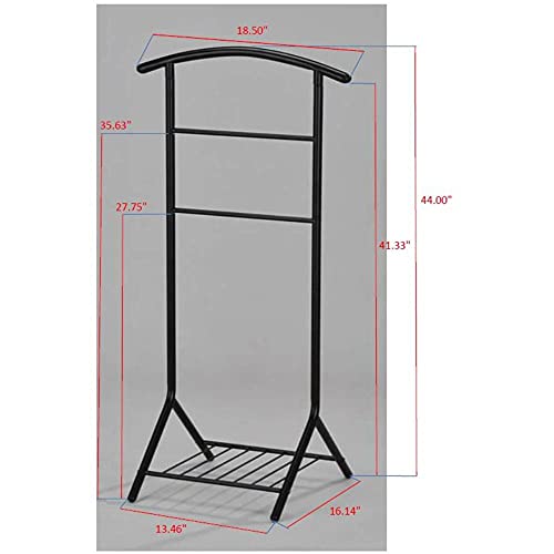 Black Metal Coat Suit Valet Stand Organizer Rack With Storage Shelf. Keep your clothing orderly and fresh with this refined black finish valet. Enjoy the bottom shelf for some simple basic storage.