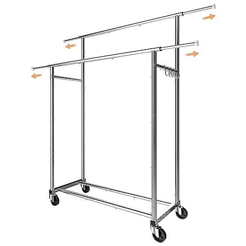 Specification: Simple Trending Double Rod Clothing Garment Rack, Rolling Clothes Organizer on Wheels for Hanging Clothes,with 4 hooks, Chrome