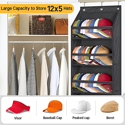 SLEEPING LAMB Over Door Hat Racks for Baseball Caps, Clear Deep Pockets Hat Organizer for Closet or Wall Hold 60 Hats Storage Holder With 3 Hooks Caps Display (Black)
