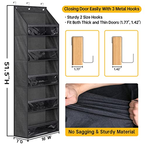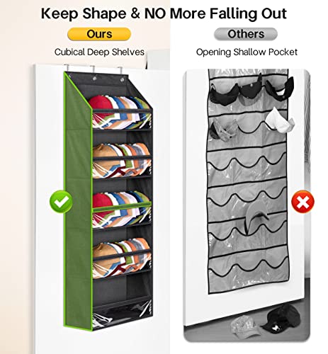 【HOLDS UP TO 60 HATS】: Each shelves size is 16″ L x 7″ D x 9.8″ H, over door baseball hat organizer can hold about 12 Hats, overall size: 51.5″ H x 16″ W, total can store at least 60 hats, our hat holder can effortlessly hold multiple flat & curved brimmed hats in its deep 7″ pockets, such as adjustable baseball cap, fitted cap, truck driver cap, wool cap, sun hat, beanie, golf cap, mens and women caps or other caps, no more clutter with caps or hats, hat hanger keeps home clean and tidy;