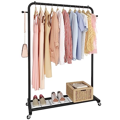 Sywhitta Clothes Rack on wheels, Clothing Rack with Bottom Mesh Storage Shelf,Sturdy Metal Frame,Rolling Garment Rack for Hanging Clothes,Coats,Skirts,39.76″ L x 16″ W x 64.56″ H,Black