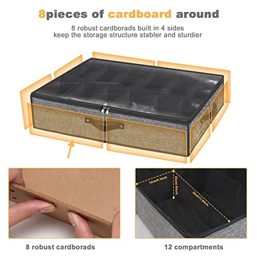 Sturdy Premium ECO Friendly:The shoe organizer for closet made breathable durable non-woven fabrics allows items air flow and the cardboard keep the shoe box sturdy,fits 12 pairs of shoes.The whole under bed shoe storage measures 29.3 x 23.6 x 5.9 inches.