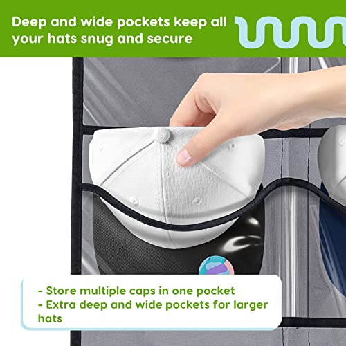Deep Pockets for Cap Protection: The hanging closet organizer comes with 24 deep and wide pockets to keep your caps safe and secure. The pockets can easily fit caps of different designs like fitted hats, snapback hats, trucker hats, cowboy and more.