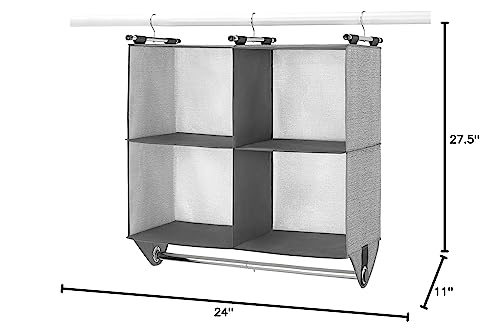 The 4-Compartment Closet Organizer from Whitmor neatly stores sweaters, bags, and accessories. The metal garment rod provides extra hanging space for shirts, pants, and dresses. The chrome rods are slipped into top locks and hang directly from your closet rod.