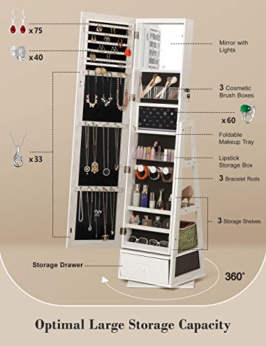 Nicetree 360° Swivel Jewelry Cabinet with Lights, Touch Screen Vanity Mirror, Rotatable Full Length Mirror with Jewelry Storage, Standing Jewelry Armoire Organizer, Foldable Makeup Shelf, White