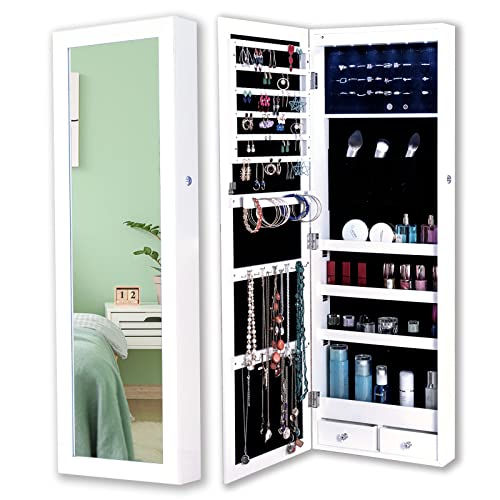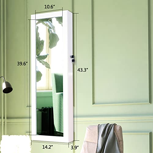 Specification: Ntufrest Mirror Jewelry Organizer, Upgraded 6 LED Lights Wall/Door Mounted Jewelry Armoire Cabinet, Full Length Mirror with Storage, Lockable Makeup Organizer and Storage,White