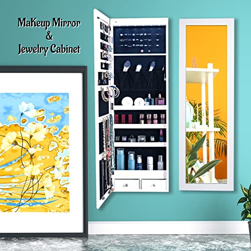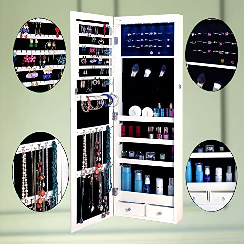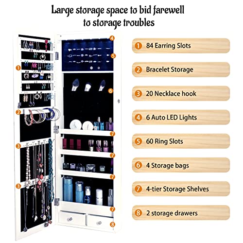 Ntufrest Mirror Jewelry Organizer, Upgraded 6 LED Lights Wall/Door Mounted Jewelry Armoire Cabinet, Full Length Mirror with Storage, Lockable Makeup Organizer and Storage,White