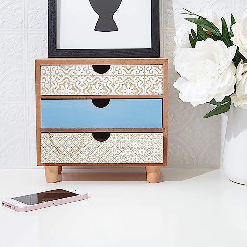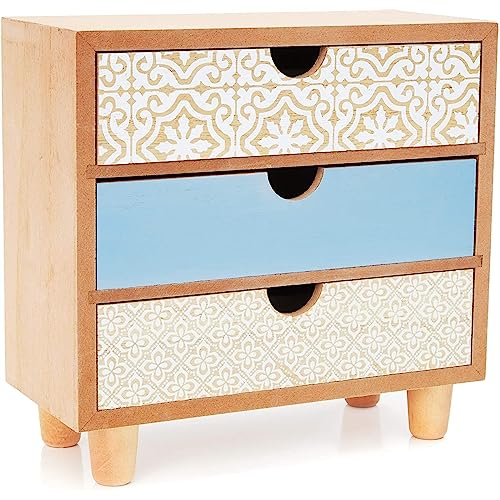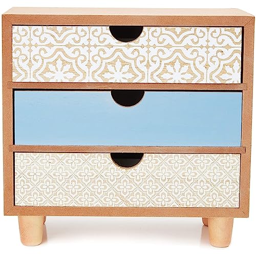 Decorative and Sturdy: The wooden storage box is made with fiberboard and features 3 assorted drawer designs; the middle drawer is painted blue, and the top and bottom drawers have painted white patterns