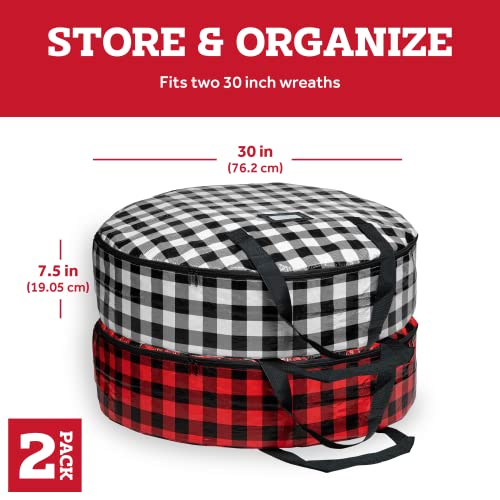 Zober Wreath Storage Container – 2-Pack, 30x30x7.5 Inch Wreath Storage Bag w/Zipper and Dual Handles for Artificial Christmas Wreaths, Garlands & Holiday Decorations – Wreath Box, Red & Black Prints