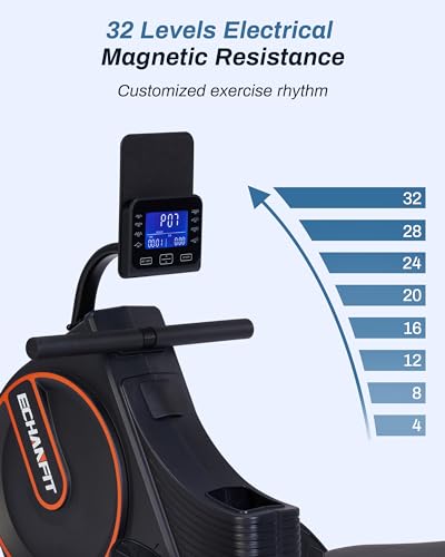 ECHANFIT 32 Levels Electrical Magnetic Rowing Machine with Preset Programs, LCD Monitor with Backlight and Tablet Holder, Adjustable Resistance, 350 LB Weight Capacity Foldable Rower for Home Gym Use