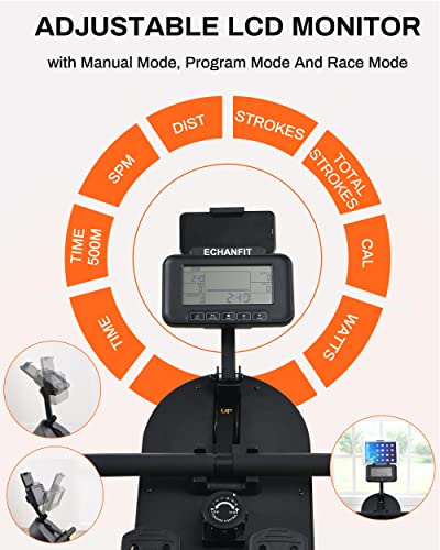 Specification: ECHANFIT Magnetic Wood Rowing Machine for Home Use with 16 Levels Adjustable Resistance, Foldable Rower with LCD Monitor, Tablet Holder and 350 LB Weight Capacity, No Assembly Required