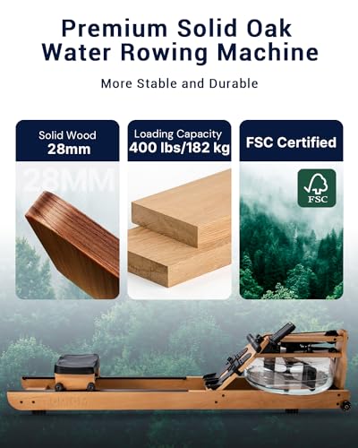 【Premium Solid Oak Construction】 TOPIOM water rowing machine is made of high-quality solid oak certified by FSC. It offers exceptional durability and stability, supporting a maximum load of 400 lbs/182 kg. With a user height capacity up to 77 inches/195 cm, it is suitable for nearly every family member.