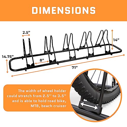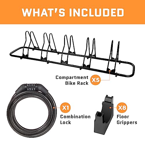 Specification: ACELETIQS Bike Stand Floor Indoor Bike Rack for Garage, Adjustable Bicycle Stand 1-5 Bike Storage Rack, Weather Resistant, Powder Coated Galvanized Steel [Floor Grips and Lock Included]