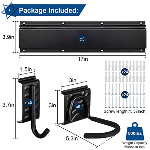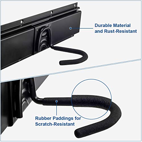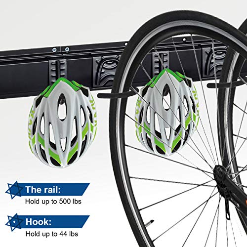 EASY TO INSTALL — Bicycle garage rack has pre-drilled holes and can be installed in just a few minutes with included instruction and hardware. The bike storage hanger has 3 tracks and 6 removable bicycle hooks, 5 accessories hook to hang your helmets or other accessories.