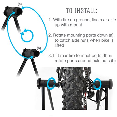 Bike Mount – Rotating mounts allow for secure fit on bike’s rear hub axle. Note: This stand may not work on Quick Release Bike Wheels or bikes wider than 5.5″ Inches across on rear axle