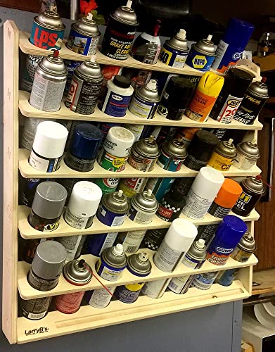 Now available in a much larger 40 can version. 1/2″ Beautiful Baltic Birch. It works great. Easy to mount using two screws. It also has a shelf pocket to store nozzles and those troublesome red spray tubes that are always getting lost. Dimensions are 27.5″ tall, 28″ wide, 5″ deep. Can holes are 2.73″ dia. Assembly required – Very easy to put together. All pieces slot together, no hardware needed. Comes un-finished and unassembled so you can varnish it, paint it, or use it as-is like I do. The only tool required for assembly is a rubber mallet or something similar. Made in the USA by LarryB’s