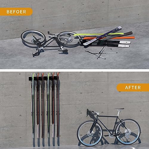 【Versatile Storage Solution】- Not only does this ski wall rack provide excellent organization for your skis, but it also doubles as auxiliary storage for other sporting equipment. You can hang your helmets, boots, ice skates, hockey sticks, and more on the hooks, keeping everything neat and tidy. The rack can be mounted to virtually any solid surface, both indoors and outdoors, providing flexible storage options.