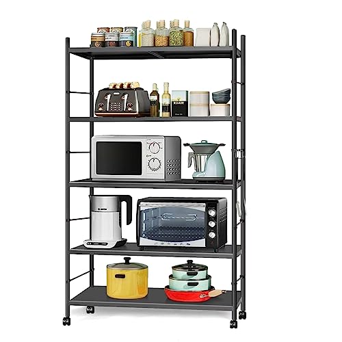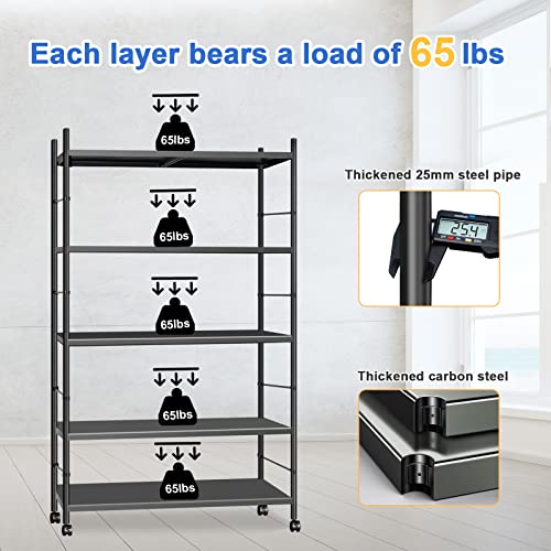 HIGH QUALITY MATERIAL: The 5 tier shelf is made of carbon steel, solid and durable. The surface of the shelf is coated to be water, rust, scratch and corrosion resistant. No problem in the kitchen or bathroom. 38.6*15.1*67in.325lbs load capacity.