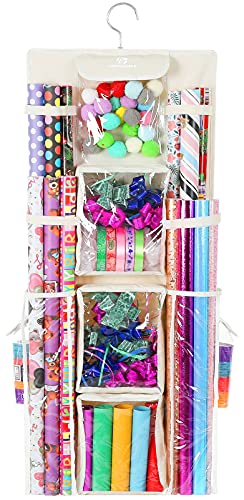 Freegrace Double Sided Hanging Gift Wrap Organizer | Large 16″ x 41″ Wrapping Paper Rolls Storage Bag | Tearproof & Space Saving Closet Gift Bag Organization Solution (Beige)
