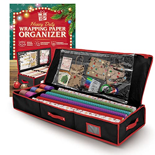 Specification: Holiday Cheer Premium Wrapping Paper Storage with Interior Pockets, Perfect for Holiday Storage and Organization and for Christmas Storage – Fits 18-24 Standard Rolls (Black & Red)