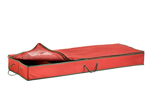 Honey-Can-Do SFT-01598 Wrapping Paper and Bow Storage Organizer. Amidst the holiday madness, we have created a nifty organizer for your wrapping paper and tools. We were tired of pulling out crushed paper rolls and flattened bows, so It is designed to protect 8 standard rolls of wrapping paper, and also has compartments for bows, tape, stickers, ribbon, and more. It has a divider that creates nearly a 10-inch by 10-inch compartment for the tools, and is designed so that they don’t intermix when held upright. It has a handle on the top and side for simple maneuvering while the full zippered closure keeps out the dust. It is covered in red nylon fabric with green accent piping. It is 40.5-inch L by 13.5-inch W by 4.5-inch H