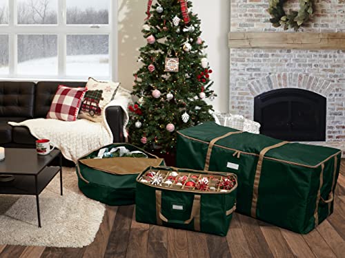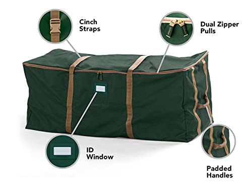 DURABLE FEATURES: Padded handles for easy carrying, exterior cinch straps to secure tree, inside pocket for easy organization, rubber ID window for efficient labeling, dual zipper pulls for quick access.
