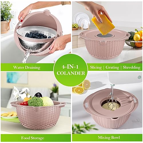 Versatile Kitchen Gadget -The multifunctional colander set is really a kitchen must have, especially in apartment. It includes a stainless-steel colander, a plastic mixing bowl with non-slid bottom, a center-removable lid and three grater attachments. The colanders and drainers are perfect for washing vegetable, rinsing rice fruits, straining pasta, preparing and storing food.