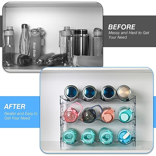 【Multi-purpose Water Bottle Rack】The water bottle storage organizer is great for organizing glass and plastic water bottles, stainless steel and insulated travel mugs, sport bottles, tumblers and more. And the water bottle holder is suitable for kitchen, pantry, countertop, and other space-constrained areas.